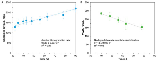 From day 32 and until the end of the test, the oxygen consumed increased gradually in the aerobic assays (Figure 3A), while in the anoxic tests NO3− concentrations decreased consistently after the first 40 days of incubation (Figure 3B), pointing to the occurrence of aerobic and denitrifying hydrocarbon biodegradation activity. From the curves slope, the corresponding biodegradation rates were obtained and are depicted in the Figure 3. For the calculation of biodegradation rates, the stoichiometry of the chemical reactions presented in Table S1 was considered.