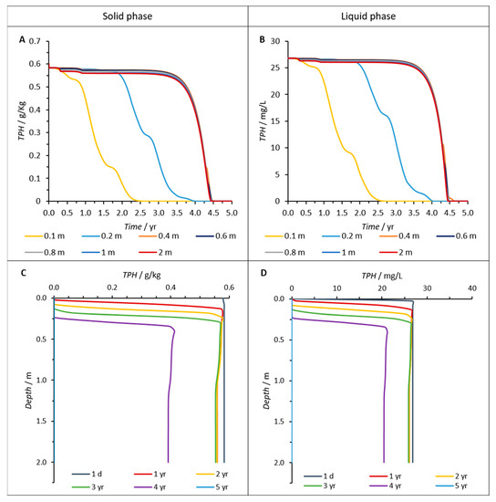 The developed mathematical model was able to predict the variation of hydrocarbon and electron acceptors concentrations, over time and at different depths. As shown in Figure 4, hydrocarbon concentrations decreased over time, both in the solid (STPH) and liquid (CTPH) phases. In the first 0.1 m depth, the decrease of STPH starts slowly and accelerates afterwards (Figure 4A), reaching 50% of the initial value after ~1.2 years (439 days). For depths higher than 0.4 m (Figure 4A,C), STPH remains relatively constant for 3.2 years (1150 days), after which it decreases consistently, reaching a 50% reduction approximately one year later (1507 days). In the liquid phase, the decrease of hydrocarbon concentration follows a similar tendency (Figure 4B,D); here, ~2.3 years (850 days) or ~4.5 years (1626 days) are necessary to reach TPH concentrations lower than 1.0 mg/L, at 0.1 m depth or at depths higher than 0.4 m, respectively. After 5 years, hydrocarbons are almost completely removed from both phases, at any depth (Figure 4).