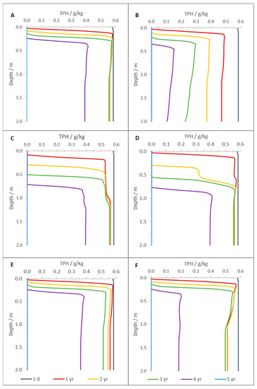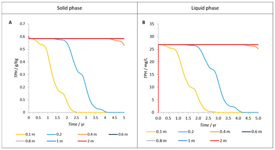 In deeper soil layers (>0.4 m), however, when just adsorption/desorption and transport processes are considered, STPH and CTPH only begin to decrease after 4 years (Figure 5). By comparison, with Figure 4A,B, it seems that microbial activity has an important role and accelerates TPH removal at higher depths. In fact, after this same time period, STPH was already reduced by 40% at 0.4 m depth when biodegradation was also taken into account (Figure 4A). Since oxygen, nitrate, iron or sulfate are not available below 0.4 m depth at 3–4 years (Figure S3), TPH biodegradation is possibly related with the activity of the methanogens.