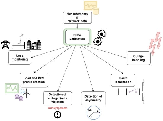 In order to support the operation of modern distribution systems, the Distribution System Operator (DSO) utilizes a variety of algorithms that provide the optimal results and decisions []. Naturally, in many cases, the input of the aforementioned algorithms relies heavily on the accurate and detailed monitoring of the system’s status []. Consequently, an intermediate process between the acquisition of the system’s available measurements and the use of control and decision-support algorithms is required. This process, i.e., Distribution System State Estimation (DSSE), constitutes an asset of great importance for the DSO as it can be used for multiple purposes, including loss monitoring, load and RES profile creation, detection of voltage limit violations and asymmetry, fault localization, outage handling, etc., as presented in Figure 1 [].