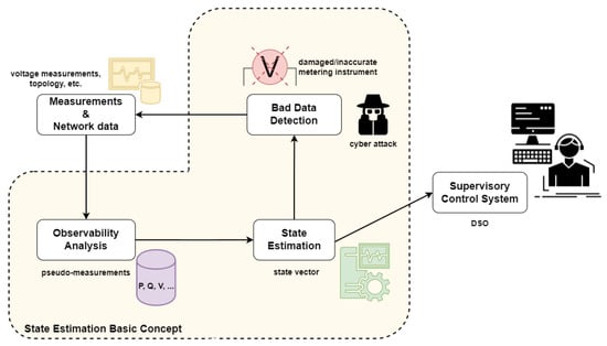 Overall, DSSE has evolved into a research field that has gathered the interest of many experts. More specifically, accurate and efficient DSSE is considered to be a complex task, not only due to the inherent unbalances of MV and LV grids, but also due to the lack of measurements, which may cause observability issues, as well as the possible existence of bad data (either caused by damaged/inaccurate metering instruments or by cyber-attacks) that need to be identified and excluded from the estimation, as presented in Figure 2 []. The aforementioned challenges may be approached in a variety of ways, usually through model-based or through more recently developed, data-driven strategies, providing a pool of multifarious solutions regarding DSSE implementation [].