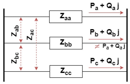 Distribution systems have a number of special attributes that render their detailed representation more complex than transmission systems. Firstly, distribution systems are unbalanced by nature, as presented in Figure 3. This is a result of the unbalanced consumption as well as the existence of mutual impendences between the lines. It should be noted that in some parts of the grid, phases may be missing by design, according to the requirements and geographical location of the loads, thereby enhancing the occurring unbalances. Thus, the modelling of the components, including lines, transformers, loads, etc., as well as the power flow equations, need to be adjusted. For example, the impendence matrix of a distribution line is formulated as presented in (1), where Z is the impendence []. Furthermore, the active and reactive power flow between two nodes is formulated as presented in (2) and (3), respectively, and the power injection is formulated as presented in (4) and (5), where  and  are the active and reactive power, respectively, flowing in phase ph between nodes i and j,  and  are the active and reactive power injection, respectively, in phase ph at node i,  is the voltage magnitude and  is the voltage angle, G and B refer to the real and imaginary parts of the admittance matrix, respectively, l is the index referring to each of the three phases of the line, and n refers to the number of neighboring nodes [,]. The complexity of these formulas lies in the separate calculation of each phase’s values, as the occurring unbalances cannot be modelled via single-phase equivalent approaches [,].