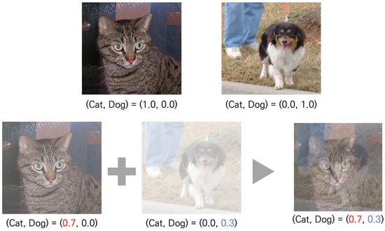 where is the same as Equation (1). In this study, follows . The last one is from , which is a result of passing through the remaining layers of F without mixup.