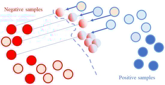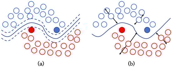 The main idea of consistency regularization is that the model’s prediction for unlabeled data should be robust to any perturbations. In computer vision, the images consist of continuous pixel values, and images can easily create novel and realistic-looking augmented data. So, many studies could implement consistency regularization by applying various perturbations or augmentations to one example. CutMix [] is a method for semantic segmentation. This method used the mixup technique as a perturbation method to force the consistencies between the model outputs and inputs of mixed examples. Cross-consistency training (CCT) [] proposed applying perturbations to the hidden representations of examples and not the model’s inputs. Moreover, several techniques for injecting noise such as dropout, adding noise tensors, or masking into features were used as perturbation techniques. Figure 2 shows that the variance in the decision boundary decreases as training considers the perturbations on the unlabeled examples []. The boundary (a) formed in a wide range may cause inaccurate predictions for some examples. On the other hand, boundary (b) separates the categories explicitly.
