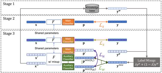Holistic methods are strategies that combine mixup, pseudo-labeling, and consistency regularization. Holistic methods are similar to the proposed method in this study in that examples are mixed and used for training in a consistency regularization manner. The studies in [] proposed a holistic method that constructed several steps, including data augmentation, label guessing, mixup, and joint training with consistency loss. In [], the authors added two new techniques comprising distribution alignment and augmentation anchoring. The distribution alignment forces the distribution of predictions on unlabeled data and matches the predictions of the labeled data. With the augmentation anchoring technique, the predictions of weakly augmented data are assigned to the labels of augmented data. FixMatch [] implemented the holistic method by subtracting the mixup technique and combining consistency regularization and pseudo-labeling. Instead, the authors assigned the label of a strongly augmented input as the model prediction on a weakly augmented input. Holistic methods have been limited to the studies in computer vision, where the mixup and data augmentation are freely adopted.