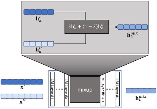where upper subscript denotes the language model that mixes up examples in the k-th layer. refers to the mixed label. Note that and do not belong to the same sentence. We visualized the entire mixup process in Figure 5.
