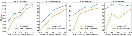 As shown in Figure 6, the proposed framework demonstrated better performance than the BERT baseline on all experiments. Particularly for NCBI-disease and LaptopReview, while the performance of BERT baseline dramatically decreased on 20% of the sub-sampled strongly labeled dataset, the proposed framework relatively maintained stable performances. Furthermore, we also observed that as the strongly labeled data size decreases, the performance decline decreases. Based on experimental results under low-resource environments, the proposed framework showed similar performances to environments where sufficient datasets are available, even with limited datasets. This demonstrates that the proposed framework would save the cost of assigning datasets for domain-specific NER tasks.