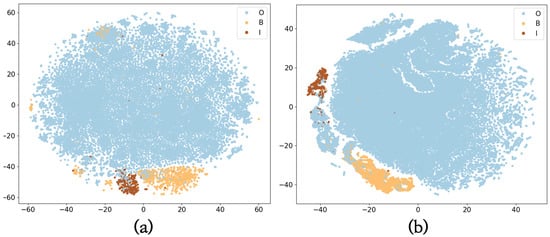 t-SNE visualization of BC5CDR-chem. The representations are extracted from language model F. (a) shows the result of the BERT baseline, and (b) shows the result of the proposed framework.