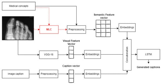 Overall scheme of our proposal. Visual features were extracted from medical images to construct the visual feature vector and train the multi-label classifier (MLC). The semantic features were computed from encoding the outputs of the MLC, combined with visual features and caption vector, and input to the LSTM for text generation. The diagram without the red box shows the training process; it shows the testing process when the red box is included. The medical concepts were not inputted directly for pre-processing but were passed through the MLC.