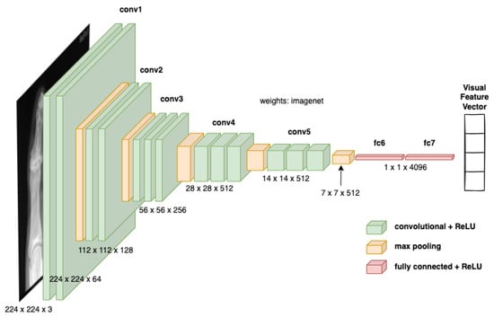 The first step of our proposal is visual feature extraction; we employed a pre-trained CNN model. We used the VGG-16 model since it is small, has been trained on the large ImageNet dataset, and performs very well on several other classification tasks. The model is composed of 16 layers, to which we input the medical images and generated a feature vector of size 4096 after removing the last classification layer, as illustrated in Figure 3. The features extracted from this layer were learned by the model while trying to predict the image class and distinguish the visual content of images. Images were pre-processed before fitting them to the VGG-16 model. They were normalized and resized to fit in the encoder and augmented with some traditional image augmentation techniques.
