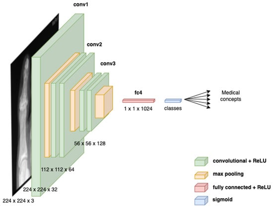 We propose using a multi-label classifier to detect and recognize concepts from medical images. For that, we trained a CNN network that was inspired by the VGG-16 network but on a smaller scale. Inputs of the model were the medical images and outputs were multiple classes, which linked to the identified concepts from visual features. We picked the top ten recognized concepts to represent each image. The predicted concepts were further pre-processed and constituted the basic units of our semantic feature encoding process. Figure 4 represents the architecture of our multi-label classifier.