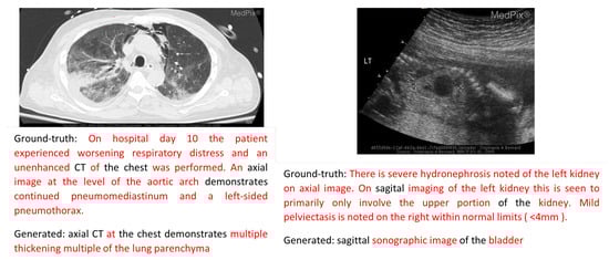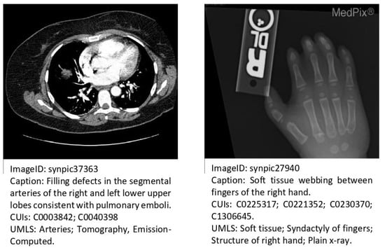 To evaluate our proposed method, we employed the ImageCLEFmed 2021 dataset [22,23], composed of three subsets for training, validation, and testing. It is composed of 2756 medical images where each image is associated with a set of medical concept unique identifiers (CUIs) and a caption consisting of one or several sentences. CSV Files (mapping images to their corresponding CUIs and captions) are provided with the raw images. Multiple image modalities and body parts are considered in this dataset, making it very challenging and more general. Figure 5 shows two samples of image–text pairs from the ImageCLEFmed 2021 dataset. The UMLs are retrieved to identify each CUI of the image. They are related to the content of the image and could give more insight into its content. For example, in the left sub-figure, CUI ‘C0003842’ is substituted by ‘Arteries’ and the CUI ‘C0040398’ by ‘Tomography, Emission-Computed’. Both concepts give more information on the content of the image and could be used to boost the understanding of the image.