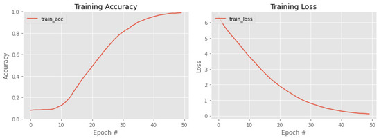 Performance of the LSTM language generation model. Left side: training accuracy; right side: training loss. Epoch # refers to the number of epochs.