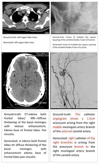 - Li, C.; Liang, X.; Hu, Z.; Xing, E.; Li, C.Y.; Liang, X.; Hu, Z.; Xing, E.P. Hybrid Retrieval-Generation Reinforced Agent for Medical Image Report Generation. In Advances in Neural Information Processing Systems 31 (NIPS 2018), Proceedings of the Annual Conference on Neural Information Processing Systems 2018, NeurIPS 2018, Montreal, QC, Canada, 3–8 December 2018; Curran Associates, Inc.: New York, NY, USA, 2018; Volume 31. [Google Scholar]