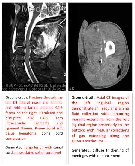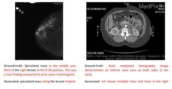 Finally, we illustrate in Figure 17 two samples of the generated captions for images where training samples pertain to different modalities (x-ray computed tomography and mammography modalities). In general, the model is shown as not being able to generate captions for images from modalities on which it has not been well-trained on. For instance, although the model predicted ‘spiculated mass, the breast’ for the left sub-figure, the model was not able to create a correct caption. Again, the model failed in determining the modality of the right sub-figure, where it was wrongly predicted as being an MRI image instead of an x-ray computed tomography.