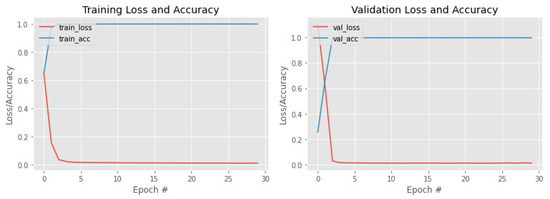 Performance of the MLC model. Left side: training loss and accuracy; right side: validation loss and accuracy. Epoch # refers to the number of epochs.