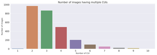 We first investigated the performance of the proposed multi-label classifier. In other words, we evaluated the performance of the proposed CNN in predicting accurate medical concepts from medical image inputs. The model was trained for 100 epochs and the accuracy was reported on the test set. Figure 10 illustrates the training and validation loss as well as the accuracy of the proposed model. Accuracy increases over time while loss decreases, which means that our model is able to learn to assign multiple labels to the input images. We obtained an F_measure value of 41.80%, which was not the best one compared to some state-of-the-art methods. However, this value was obtained because we considered 10 medical concepts for each image, which was the maximum number of concepts for images of the used dataset. As can be seen in Figure 11, regarding the distribution of CUIs per image, most of the medical images only had two CUIs. In contrast, very few images had either one or more than five CUIs. The results, in terms of F_measure, are compared in Table 4. Our results are comparable to the state-of-the-art results on the ImageCLEF 2021 dataset. Again, the best results (50.50%) were obtained by the same team Schuit et al. [27] for caption prediction, where a VGG network was used to encode medical concepts. A K_nearest neighbor algorithm was used with perceptual similarity to select concepts that are most likely closest to the given image. In Wang et al. [25], the authors used a pre-trained network for encoding the medical concepts within a multi-label classification task. The medical concepts were divided into four semantic categories, namely imaging type (IT), anatomic structure (AS), findings (FDs), and others; therefore, images were annotated accordingly. Similarly, Jacutprakart et al. [28] achieved an F_measure of 41.20% by using a pre-trained DenseNet-121 model for the multi-label classification process after categorizing the medical concepts into different semantic types. Next, two types of training were performed to classify the semantic type and predict the appropriate concept. In Beddiar et al. [15], the authors employed a multi-label classifier, where features were extracted using MobileNet-V2 and then a GRU network was used for the classification.