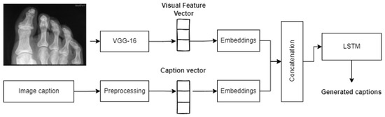 - An end-to-end deep learning-based network was employed for text generation, fusing visual and semantic features extracted from images as well as their associated medical concepts. The model merges different networks: MLC for semantic feature encoding, VGG-16 for visual feature extraction, caption embedding, and an LSTM network for caption generation.