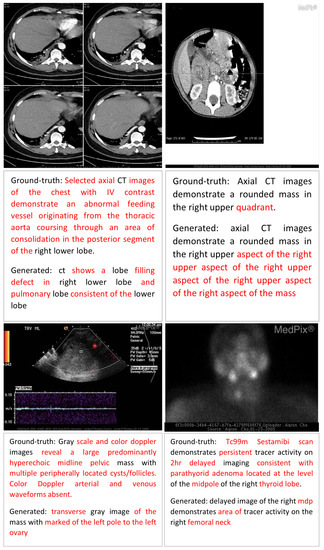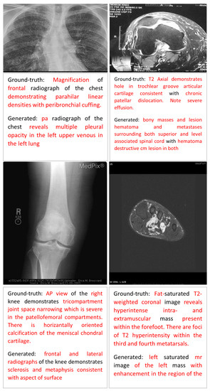 - Beddiar, D.R.; Oussalah, M.; Seppänen, T. Attention-based CNN-GRU model for automatic medical images captioning: ImageCLEF 2021. In Proceedings of the Working Notes of CLEF 2021—Conference and Labs of the Evaluation Forum, CEUR Workshop Proceedings, CEUR-WS.org, Bucharest, Romania, 21–24 September 2021; Volume 2936, pp. 1160–1173. [Google Scholar]