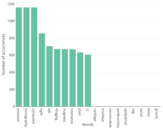 We show in Figure 15 recurring and rare words from the training captions. Words, such as ‘emission’, ‘tomography’, and ‘computed’ are the most recurrent in the training dataset; the model could smoothly identify their embeddings and predict them because it was well trained on them. However, words, such as ‘tarsal’, ‘bolus’, and ‘micronodule’, were crossed by the model only once and, thereby, were not predicted accordingly.