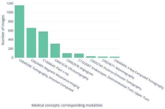 We show in Figure 18 the number of images per modality and the corresponding medical concept (modality). We can see that the training set was dominated by images from the tomography emission-computed modality, while few images were from the mammography modality. This justifies the number of occurrences of words ‘tomography’, ‘computed’, and ‘emission’ in the vocabulary of our model.
