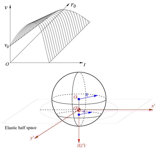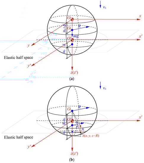 Coordinate system establishment: One coordinate system (x, y, z) is established with the center of the just-colliding rigid sphere as the coordinate origin and t as the time coordinate. The other coordinate system (x′, y′, z′) is established with the collision center of the elastic half-space interface as the coordinate origin O′. The half-space interface equation is z = R(z′ = 0), t′ is the time when each point on the sphere starts to collide with the half-space (that is, the time of the centroid of the sphere moving), as shown in Figure 1a.