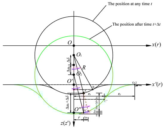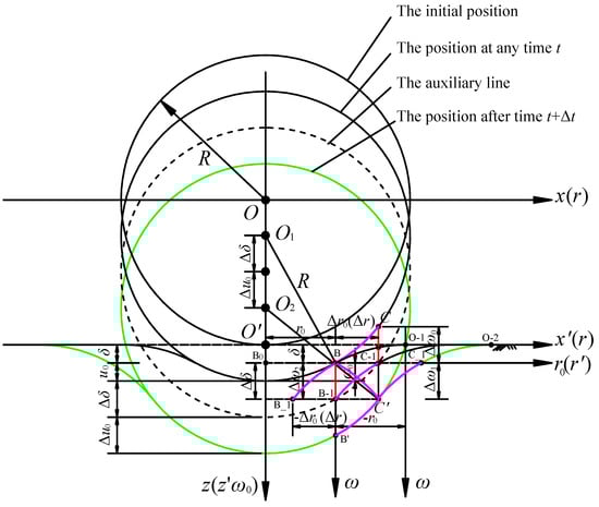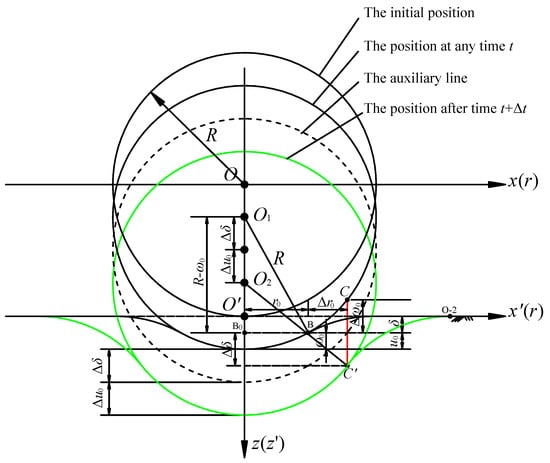 The sphere moves from O1 to O2 in micro time Δt, the boundary point in the contact area of a sphere and half-space are B, C′, in the coordinate system ω0B0r0; the sphere’s motion(coordinate) state parameters are u0, δ, ω0, r0; the delta state parameters are Δu0, Δδ, Δω0, Δr0—see Figure 3.