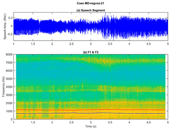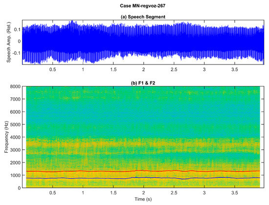 Example of a sustained utterance of vowel [a:] from a normative subject (male, 37 years old): (a) original speech signal, showing slight amplitude changes through the utterance; (b) spectrogram on the background and two formants in blue (first formant) and red (second formant). The harmonic spectrum (background) shows stable harmonics all over the recording, seen as horizontal yellow parallel bands, which extend from 120 Hz to almost 4000 Hz, indicating a moderate voice quality produced by a normal larynx function. The first two formants (blue and red lines) show some fluctuations, especially apparent from 1.8 s until 3.5 s, indicating a possible slight mandibular movement during phonation, as both lines maintain a relatively constant separation.