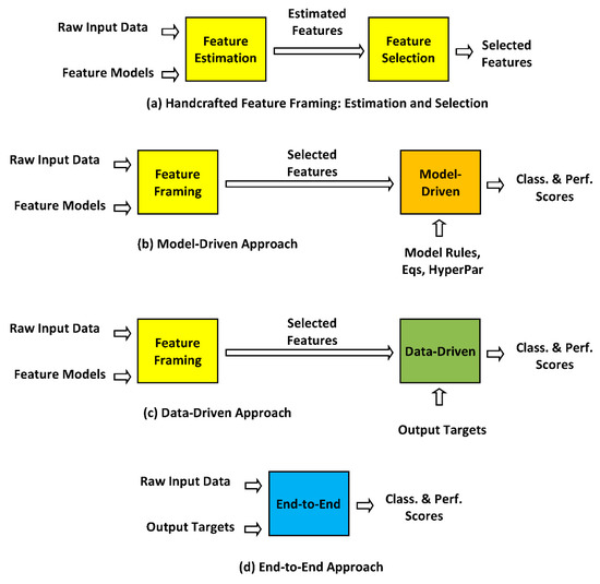 Different strategies for ML pathology detection and classification: (a) Handcrafted feature framing, comprising feature estimation followed by feature selection, based on physiological and acoustical models of voice production to estimate input features; (b) Model-driven approach, using features extracted by (a) and detection and classification model rules and mathematical structures such as Gaussian mixture models, random forests, shallow neural networks, support vector machines, etc. to estimate classification and performance scores; (c) Data-driven approach, also using features modeled by (a) and detection and classification by deep learning methods as deep neural networks, associating expected output targets on intensive numerical computation to estimate classification and performance scores; (d) End-to-end approach, where stage (a) is omitted, using direct raw input data and desired output targets to produce classification and performance scores. Classically, MD (b) and DD (c) approaches take input features provided by a previous HF stage (a). End-to-end approaches do not require a previous HF stage (a).