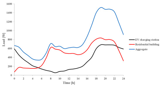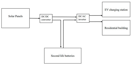The study is based on an off-grid PV system designed for the energy consumption of a typical house located in Oxford, UK. The study assesses the impacts of adding EVCS demand on the ESS technical parameters, energy exchange, and degradation. The proposed off-grid renewable energy system with an EVCS component could be listed as PV panels, DC-DC converter, second life battery packs, DC-AC inverter, residential building’ load, and EVCS. The block diagram and components of the proposed energy system is shown in Figure 1. According to the figure, the solar energy is converted to electrical energy by PV panels and some of the generated electrical energy will be stored in the second life battery packs, while the rest of the energy would be consumed directly by the AC consumers such as the residential building electric consumers and EVCS. The load demand profiles are presented in Figure 2 [,]. The demand profile represents the average UK household load according to the CREST demand model for 15,000 households in the UK []. The red line in Figure 2 indicates the building’s daily electricity load. The EV charging station daily load applied to the system is also shown by the black line in Figure 2. The aggregate hourly load is also calculated based on the building and EV charging station loads as presented in Figure 2.