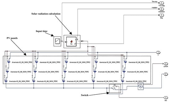 Figure 3 and Figure 4 demonstrate the block diagrams of the solar system and the second life battery pack. The SoC is monitored frequently during the solution of the model and is used for controlling the switches in the PV system to prevent battery packs from over charging. A MATLAB function is used to calculate the solar irradiance in different times during the day, the details of which will be presented in the next section (see Figure 4).