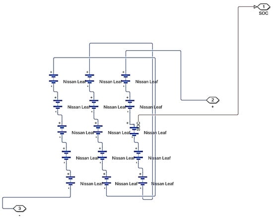 Block diagram of the 2nd life Nissan Leaf battery pack in MATLAB SIMULINK.
