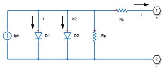 where, and are diode saturation currents for diodes 1 and 2 shown in Figure 5, respectively. is the thermal voltage, and are diode emission coefficients and is solar-generated current, respectively. The mentioned PV parameters are obtained from MATLAB SIMULINK Simscape library for Amerisolar PV panel the specifications of which are provided in Table 3 [].
