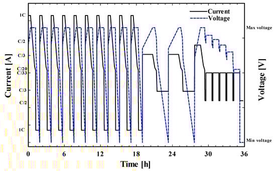 The experimental data for the parameters in this model is obtained from the literature [,,,]. In Nissan Leaf prismatic module, there are two cells integrated in a series configuration. In the reference [], the Nissan Leaf battery is aged using an accelerated ageing profile (Figure 6) [] in which the second life modules are put under constant current-voltage charging (=1C) and constant current discharging (=1C) at 25 °C environmental temperature. The reference performance test (RTP) is done every 25 cycles to measure the module capacity fade and HPPC test []. The HPPC test results are used to fit ECM Rint model parameters the results of which are shown in Figure 7, Figure 8 and Figure 9.