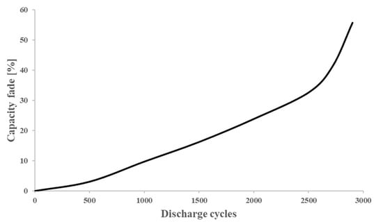 Nissan leaf second life battery capacity fade in various discharge cycles [,,,].