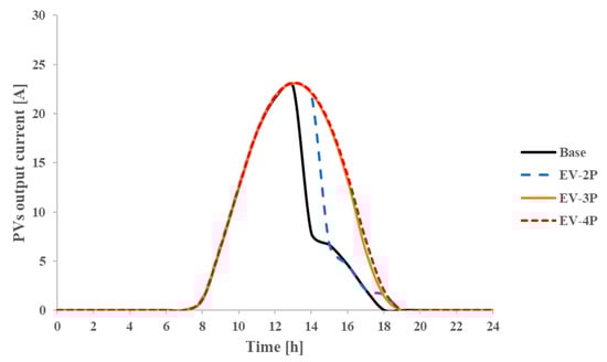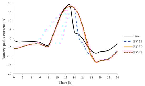 Figure 11 demonstrates the current output of the PVs to the system during the day for different scenarios. As mentioned before, a switch, controlled by the batteries’ SoC parameter is adopted to prevent the batteries from overcharging. Therefore, the switch will break the connection between the PVs and the battery storage system when the batteries are overcharged. The activation time of the switch can be figured out in Figure 11. For the base scenario (black line), in which only residential building demand is applied to the system, the switch is turned to active mode right after reaching the peak current value at 1 PM. The extra power generated by PVs would not be directed to the system afterward resulting in a sharp increase in PV current flow through the system after 1 PM. An increase of second life battery pack size by an increment of the number of modules from 2 to 4, when extra EVCS load is applied, leads to an increased PV system current flow to the system after reaching peak hours. This is due to an increase in the overcharging limit of the energy storage system and higher amounts of stored energy. Accordingly, the switch activation time is delayed by an increase in the number of packs.