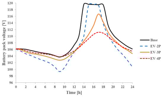 Table 4 presents the energy generation and demand for different scenarios in this study. By adding extra EVCS load to the system in the EV-2P scenario, while the number of SLB packs is kept constant (compared to the base scenario), the minimal increase in PV panel power generation is seen due to variations of their operating voltage affected by battery packs voltage variations shown in Figure 13. An increase in SLB packs’ size to 17.55 kWh (EV-3P) and 23.4 kWh (EV-4P) leads to an increase in PV panel energy generation by 21% and 21.27%, respectively, resulting from an increase in electricity storage capacity which allows higher rates of energy storage and lowering variations of PV panels operating voltage.