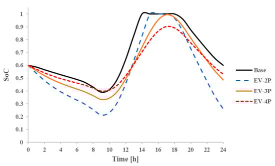 Figure 14 presents the SoC variations of the second life battery packs in transient conditions during the day for different scenarios. In particular, the comparison of the base and EV-2P scenarios (both with two battery packs) indicates that adding extra load demand to the system (EV charging station load) results in a rapid discharge of the battery packs from 00.00 to 01.00. Furthermore, the second life battery packs in the EV-2P scenario would be fully charged by approximately 1 h delay compared to the base scenario (which is fully charged at around 14.00). The final SoC of the battery packs also decreased dramatically from 60% (base scenario) to 26% (EV-2P scenario) by adding EVCS load to the system which could result in a significant mismatch between load and energy generation for the next day. To solve this issue the number of battery packs are increased in scenarios EV-3P and EV-4P to 3 and 4 packs, by assuming that the number of PVs are constant. According to Figure 10, by increasing the number of battery packs, the discharging curve between 10.00 to 12.00 is shifted upward by nearly 10%, and the SoC peak has decreased steeply due to the increased capacity of the ESS. Furthermore, the final SoC has increased by escalating the number of battery packs to nearly 53% for the EV-4P scenario. This suggests that increasing the SLB EES size up to 23.4 kWh would be beneficial in gaining a stable energy exchange between the components and reducing the energy generation-consumption mismatch in the proposed system. The main drawback of the size increment of energy storage system would be the increase in its cost, which might be solved by the employment of SLBs given their relatively lower price when compared with brand new batteries.