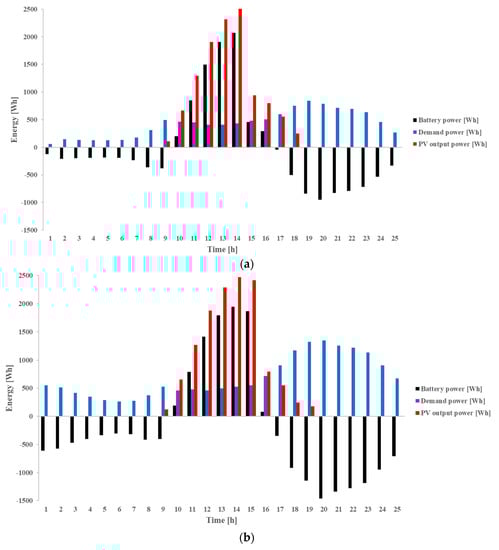 Global concerns surrounding the decarbonization of energy systems have notably increased over the past years []. Distributed energy generation systems such as PV panels are one of the most promising technologies primarily contributing to the building service industry []. However, the main improvement to the technology has been in connection with the electrochemical efficiency of the PV cells []. Despite notable technological advancements, there are various technical challenges associated with their adoption in the building sector including the mismatch in the supply and demand timing. One of the possible solutions to address this challenge is to install electric storage systems (ESS) []. The ESS, integrated with the renewable energy systems equipped with PV panels, especially in the stand-alone (off-grid) systems, is used for peak shaving and power shifting from day time to peak load hours (mostly evenings) []. In stand-alone renewable energy systems in buildings, the total energy demand is supplied by solar or other renewable energy sources [], making the energy supply and demand management an integral part of the system [,].