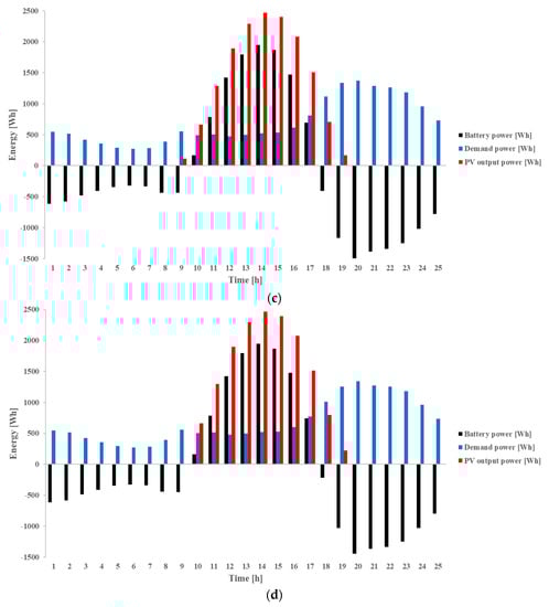In this section, the energy exchange between the main components of the system; ESS, PVs, and the demand side is demonstrated. Table 4 presents the energy generated by the solar system against the demand side’s consumption. For the base scenario, in which the solar system is designed to cover only the residential building demand, a significant difference is not observed between energy supply and demand. However, the aggregated demand has overcome the supply energy value by adding an extra load to the solar system. The difference between the energy supply and demand needs to be compensated by the amount of energy available in the batteries (the initial SoC of the batteries equals 60% in the simulations) in this scenario (EV-2P). This must be noted that the simulations are performed by considering the worst-case scenario; the solar irradiance and residential building energy demand are at their minimum and maximum rates during the year, respectively. The mismatch between energy supply and demand is expected to be minimum in the warmer months of the year. Table 4 indicates that increasing the number of second life batteries results in minimizing the difference between the energy supply and demand, which could increase the stability of the proposed energy system. The hourly energy exchange rate between the system components is shown in Figure 15a–d for different scenarios.