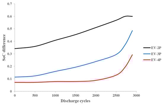 The SoC difference in different second life batteries discharge cycles for various scenarios.