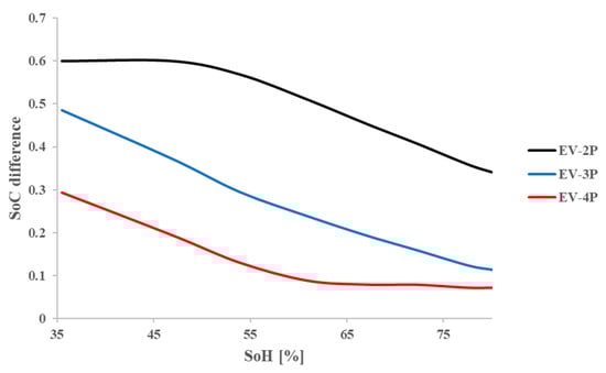 The SoC difference in different second life batteries SoHs for various scenarios.