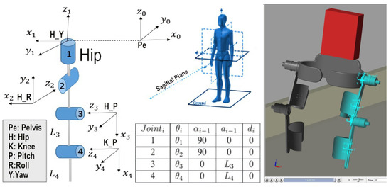 The simulation and design of the rehabilitation hip exoskeleton were modelled on the Denavit–Hartenberg (DH) parameters as shown in Figure 3 using the MATLAB and Autodesk Inventor software. The actuator selection was an SEA for the active hip joint. The hip rehabilitation consisted of a pelvis, four links for both legs and four joints that were active, except the knees, which were passive, ending up with a four-degree-of-freedom (DoF) prototype moving in the sagittal plane. The limitations and the range of motion (RoM) for each joint were based on the data in Table 1 [8]. The trunk and exoskeleton masses were connected to a body-weight-supported treadmill similar to the one used with the LokomatPro exoskeleton [53].