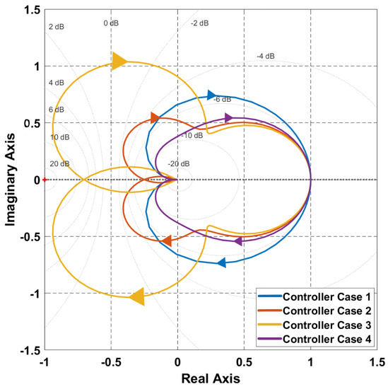 For the robustness analyses of the system, we checked the gain () and phase margins (), as the margin is one way to specify how much uncertainty the controller design can handle before the system becomes unstable [59]. Therefore, we checked the pure gain margin/classical gain margin () and pure phase margin/classical phase margin () for all controller cases that examined the controller’s sensitivity to different uncertainties. Table 4 shows, for instance, that the controller Case 1 was still stable if the gain variations in a real system were up to 33.2 dB higher than those in our designed model. The same was valid for stability if the phase variations in the real system were up to deg higher than those in the designed model. However, this variation was valid only if there was a or only, which is uncommon in real scenarios; thus, we analysed the controller cases with a combination of both and called (see Table 4). The showed that the border of in Case 1 was within (0.2–4.5) around the nominal point 1 of the Nyquist plane, while the tolerance for phase variation was within deg. Another way to analyse the robustness of a system to uncertainty and variation was studying the Nyquist plot (see Figure 4) for each controller case.