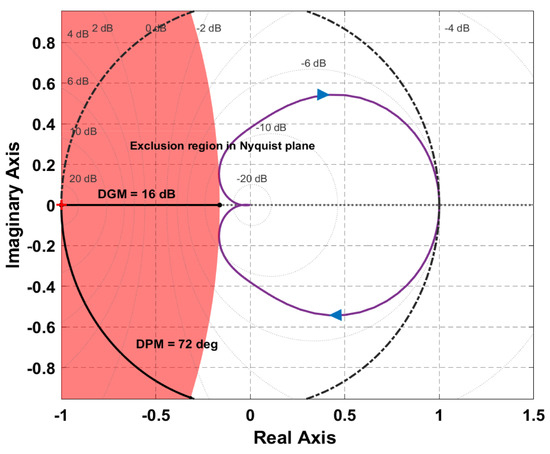 The DM visualises the stability of a closed-loop system for a combination of gain and phase variation. The margin shows how much uncertainty the controller can tolerate before the system becomes unstable. Another method for investigating system stability is using Nyquist’s stability criterion, which is elaborated in [51]. The stability of the system is described by how far the Nyquist curve can move away from the point (−1) before the system collapses.