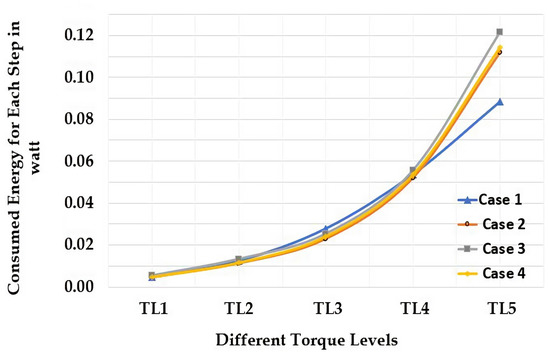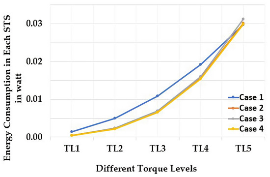 Additionally, the higher the torque/angular speed of the STS and walking activity, the higher the RMSEs. However, in analysing the energy consumption required for each step in STS and walking, we noticed that the controller Case 4, considered to be the most robust regulator, demanded less energy in STS compared with other controller cases (see Figure 6 and Table 6). Therefore, we found the highest number of times by pursuing STS using controller Case 4 at all torques.