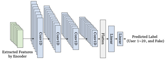 Figure 4 is a diagram showing the structure of a neural network for user authentication and deep voice detection. A vector extracted from speech through a separate autoencoder is input into the classifier. In the scenario, the autoencoder is deployed on a mobile device. The classifier classifies a total of 21 classes including a deep voice and User 1∼User 20. The vector input into the classifier goes through four one-dimensional CNNs. After that, a flattening operation is performed to be input into the fully connected layer. Unlike a two-dimensional CNN, a one-dimensional CNN is a neural network mainly used for processing sequential data. Our dataset was sequential data because it was voices. Therefore, we used a one-dimensional CNN. The input vector goes through four one-dimensional CNNs. After that, a flattening operation is performed to input the vector into the fully connected layer. After flattening the vector, it is input into two fully connected layers. The output layer does not include the softmax activation function for multiple classifications. Since the softmax activation function is applied to the cross-entropy loss function provided by PyTorch, a separate activation function is not used for the output layer. Table 3 shows the details of the hyperparameters. These are the results derived through hyperparameter tuning. The input shape of the classifier was (8, 163), and the number of neurons in the output layer was 21. Since the number of labels was 21, the number of neurons in the output layer was set to 21. The output channels of each Conv1D layer were 32, 64, 32, and 8. The number of output neurons in the fully connected layer was 64 and 21. The filter size of the convolutional layer was 15, and the stride was 1. After that, it was flattened and made into a 1-dimensional array of a length of 856. Since it was a multi-class classification, cross-entropy loss was used, and Adam with a learning rate of 0.0001 was used as the optimization function. Finally, the epoch was set to 50, and the batch size was set to 128.