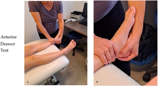Anterior Drawer Test (A: hand position B: drawing the talus and calcaneus anteriorly) and Medial Talar Tilt Test (A: hand position B: talar tilt action).
