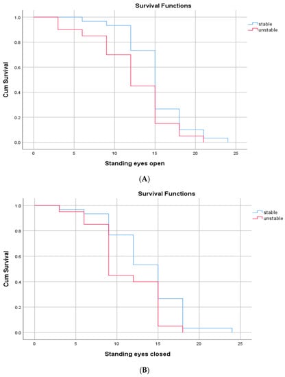 Survival curve for the level of losing postural balance in: (A) standing eyes open position (B) standing eyes closed position; (C) tandem-dominant leg forward; and (D) tandem non-dominant leg forward position] in individuals in the “stable” and “unstable” groups. Cum = cumulative.