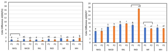 Regarding ΔE, the results are shown in Figure 2. At t1, MF(P1) and MH(P2) achieved the highest ΔE(t0/t1), but only NX3L showed a colour difference between P1 and P2 (p = 0.04). At t7, the ΔE(t0/t7) values of each tested RLA were different from the ΔE(t0/t1) ones. In particular, RXL and RXD showed the highest ΔE(t0/t7) both in P1 and P2. RXD and MF showed different ΔE(t0/t7) values in P1 and P2 (RXD, p = 0.00; MF, p = 0.00), but only RXD was above the PTC (RXD = 17.964 ± 0.318; MF = 0.640 ± 0.107), while only ΔE(t0/t1) of MF (P1) and MH (P2) exceeded the PTC, and the ΔE(t0/t7) values for each RLA were above this value. Then, all RLAs tested changed the colour after 7 days of storage in water (p < 0.05).